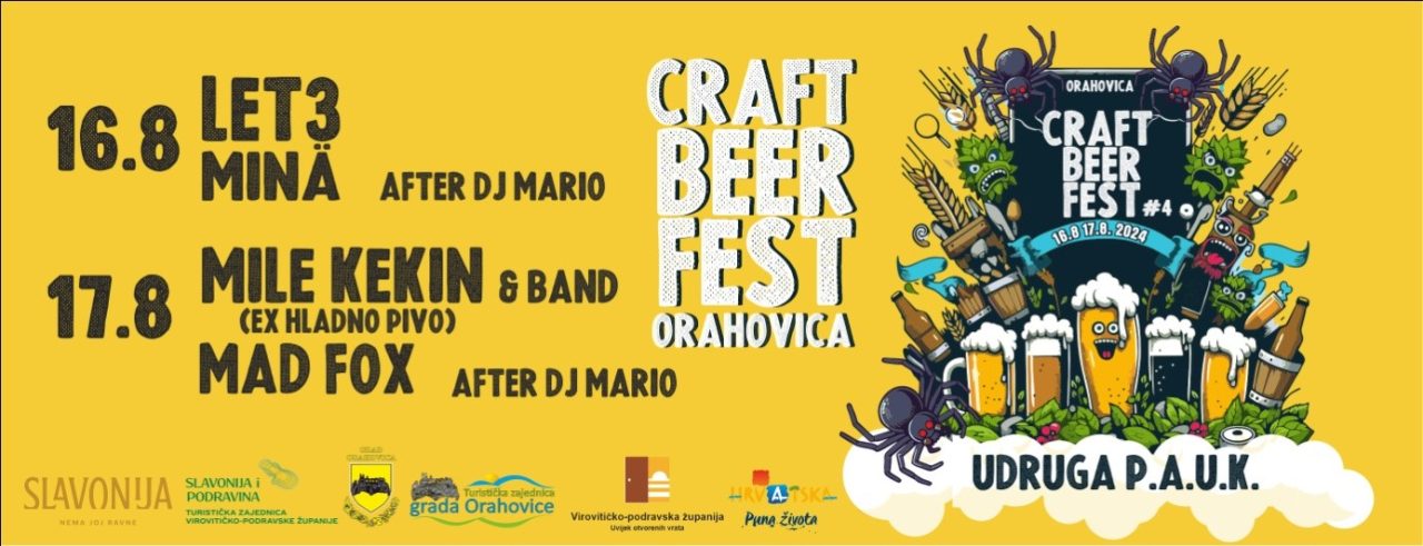 Od 16. do 17. kolovoza 2024. s početkom u 18 sati u središnjem gradskom parku Orahovica predstavit će se pet craft pivovara. Osim toga posjetitelji mogu uživati u odličnoj pivskoj hrani, glazbi i nastupima DJ Mario, Mina, Mad Fox, Let3, Mile Kekin&Bend. Chill zona ponudit će opuštajuću atmosferu uz akustične izvedbe, a drugog dana održat će se natjecanja u ispijanju piva za muškarce i žene.