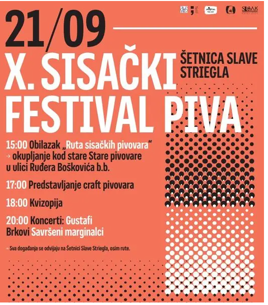 Za ljubitelje piva, izdvajamo, nešto malo južnije, točnije u SiskuFestival piva koji će se održati 21. rujna 2024. Organizator, TZ Grada Siska, i ove je godine okupila razne vrhunske proizvođače piva, a ne sumnjamo kako će okupiti i razne pivoljupce, koji će osim u vrhunskom domaćem i craft pivu imati priliku uživati u kvalitetnoj gastro sceni uz zvuke Gustafa, Savršenih marginalaca i Brkova. Osim toga posjetitelji će sudjelovati u edukativnim programima o procesu proizvodnje piva.