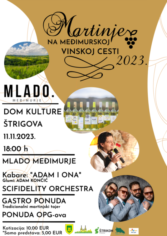 U subotu, 11. studenoga, s početkom u 18 sati u Domu kulture Štrigova održat će se već tradicionalna martinjska manifestacija na Međimurskoj vinskoj cesti „Mlado Međimurje“. Deset renomiranih međimurskih vinarija, Banfivina, Cmrečnjak, Dvanajščak-Kozol, Horvat, Jakopić, Knehtl Medenjak, Kocijan,Kunčić, Preiner i Štampar, predstavit će svojih deset mladih vina koja pršte od nježnosti i živahnosti. Osim prepoznatljivog laganog okusa mladog vina s niskim udjelom alkohola i intenzivnog te privlačnog mirisa lepršave svježine, posjetitelje martinjske manifestacije očekuje i glazbeno-poetski spektakl Adama Končića, kabare “Adam i ona”. Nakon kabarea štrigovsku scenu preuzimaju Scifidelity Orchestra koji će dodati glazbenu pozadinu martinjskoj večeri.