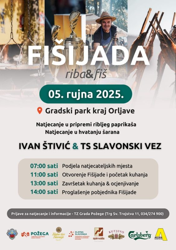 U petak, 5. rujna 2025., Gradski park kraj Orljave postaje središte najboljeg fiš-paprikaša i slavonskog druženja. Više od 50 majstora iz cijele Slavonije natječe se u pripremi fiša po tradicijskim receptima; svaka ekipa dobiva 3 kg ribe, vodu i drva. Glazbeni dio predvode Ivan Štivić i TS Slavonski vez, uz igre za publiku, animatora i voditelja. Posjetitelje očekuju razne riblje delicije te omiljena dječja atrakcija, hvatanje šarana u uređenom ribnjaku.