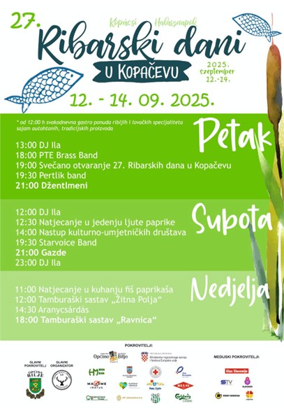 Ribarski dani u Kopačevu jedno su od najpoznatijih gastro-kulturnih događanja u Baranji, a ove godine održavaju se 27. put – od 12. do 14. rujna 2025. Program spaja tradiciju, gastronomiju i zabavu, pa posjetitelji mogu doživjeti pravi baranjski ugođaj kroz riblje i lovačke specijalitete, ali i kroz bogat glazbeni i kulturni sadržaj. Osim službenog programa, od 12 sati svakog dana posjetitelje očekuje bogata gastro ponuda ribljih i lovačkih specijaliteta, uz sajam autohtonih i tradicionalnih proizvoda. Time Ribarski dani u Kopačevu postaju mjesto gdje se isprepliću okusi, zvuci i običaji Baranje, pretvarajući rujanski vikend u pravu feštu za sve generacije.