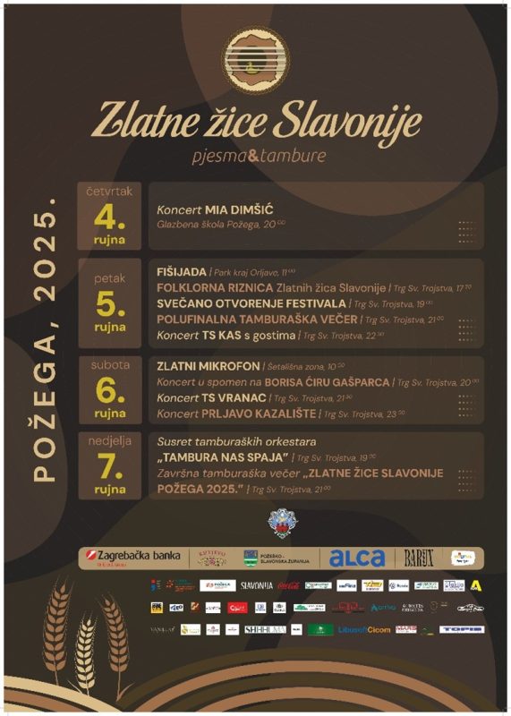 Glazbeni festival Zlatne žice Slavonije ubraja se među najposjećenije manifestacije koje promiču kulturno-glazbenu baštinu. Više od pola stoljeća sustavno čuva i razvija tradicijsku, osobito tamburašku glazbu, potvrđujući živu povezanost s gradom Požegom i ritmom vremena. Program traje tri dana, održava se prvog vikenda u rujnu te je oblikovan kroz tematske večeri posvećene slavonskom tradicijskom izričaju. Ulaz na sve programe je slobodan.
