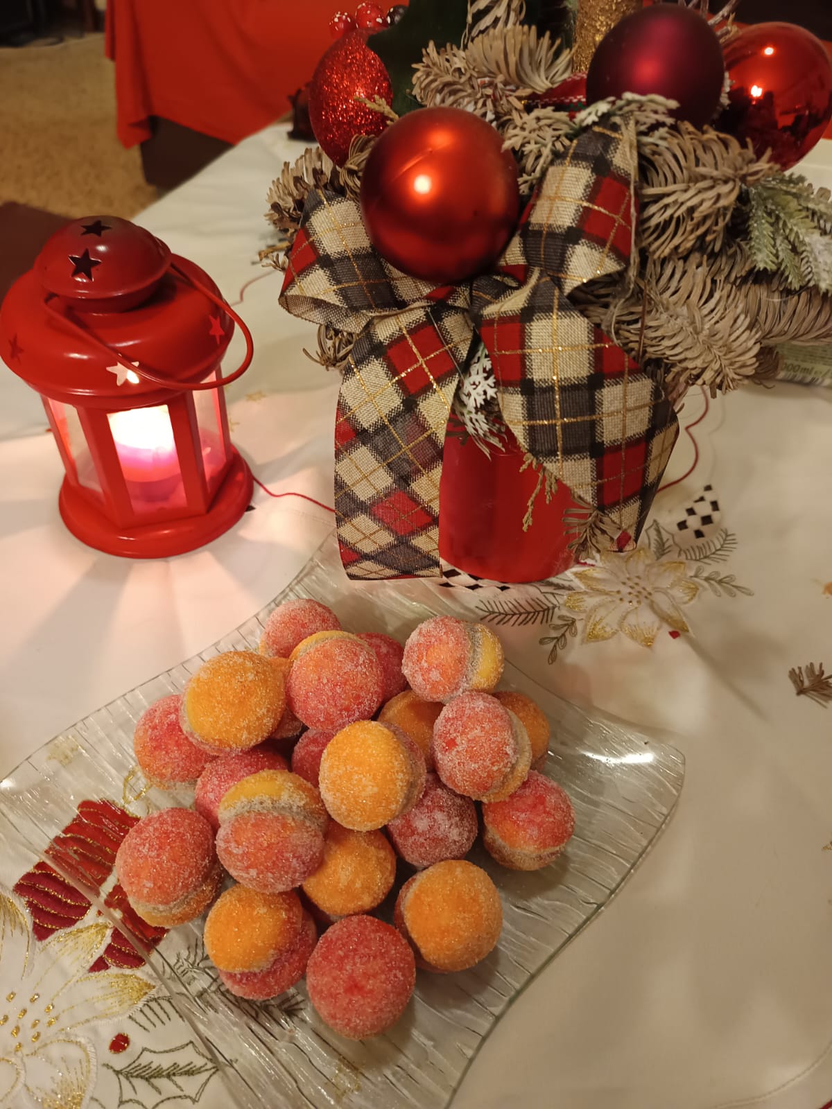 Svaku breskvicu umočiti krajeve u vodu obojanu aromom pa uvaljati u kristal šećer.