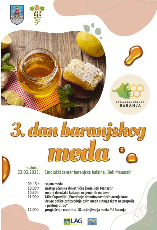Ljubitelji meda i pčelinjih proizvoda imat će priliku uživati u bogatom programu ovogodišnjeg 3. dana baranjskog meda, koji će se održati u Etnološkom centru baranjske baštine. Manifestacija, koju organizira Pčelarska udruga Baranja, donosi niz aktivnosti za sve generacije – od sajma meda i edukativnih predavanja do kulturno-umjetničkog programa i proglašenja najboljeg meda.