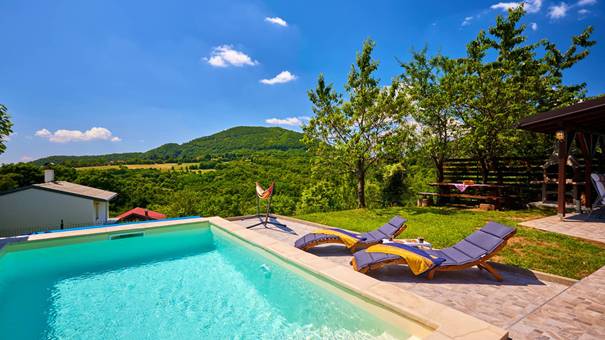 Mountain Home 02 in Kupčina Žumberačka zeichnet sich besonders dadurch aus, dass es Träger des EU-Ecolabel-Zertifikats ist, was hohe Standards in Bezug auf Nachhaltigkeit, Energieeffizienz und einen verantwortungsvollen Umgang mit der Natur bestätigt. Das Haus bietet Platz für bis zu 9 Gäste (7 + 2) und ist ideal für Familien, da es über einen großen Außenbereich von etwa 800 Quadratmetern, Einrichtungen für Kinder und einen Sommerpool verfügt. Für vollständige Entspannung stehen ein Whirlpool und eine Sauna zur Verfügung, ergänzt durch die Atmosphäre eines Baches sowie einen gestalteten Hof mit Pavillon und gemauerter Grillstelle. Das Innere umfasst drei Schlafzimmer, zwei Wohnbereiche mit der Möglichkeit zusätzlicher Schlafplätze, eine voll ausgestattete Küche und zwei Badezimmer sowie einen privaten Parkplatz.