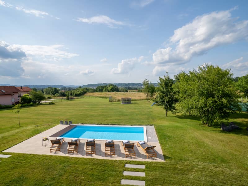In den kälteren Monaten können Gäste die private Sauna in jedem Haus sowie den Außen-Jacuzzi nutzen, der vollständige Entspannung mit Blick auf die Hügel von Zagorje bietet. An wärmeren Tagen laden der gemeinsame beheizte Pool und das Sonnendeck zum Schwimmen und Entspannen ein, während ruhige Momente im Schatten der Bäume oder beim Morgenkaffee auf der Terrasse mit Panoramablick genossen werden können.
