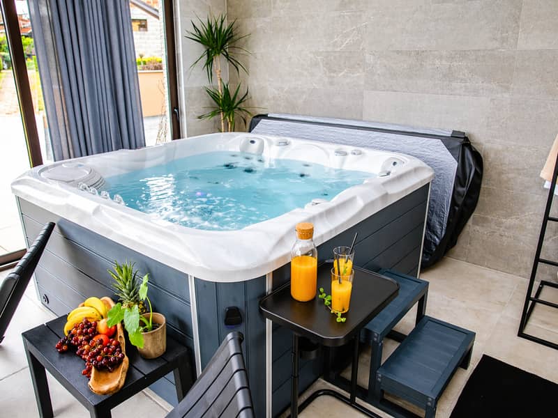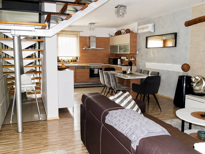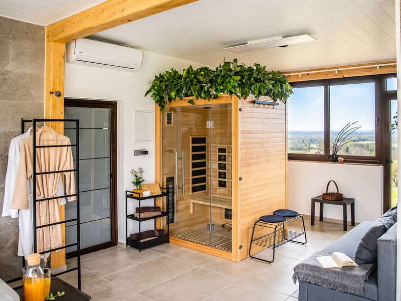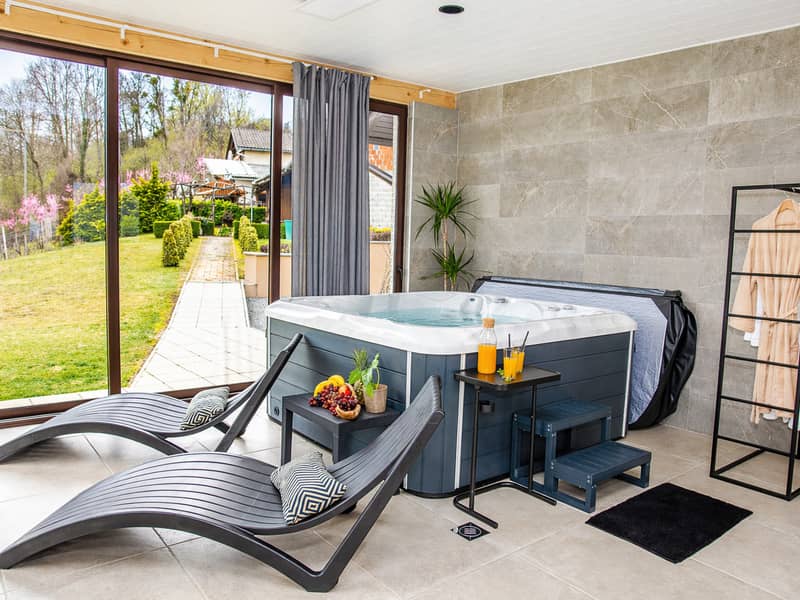 In colder months, the wood-burning fireplace creates a cozy atmosphere. Full relaxation is offered by the private wellness area with an indoor jacuzzi and infrared sauna overlooking the garden and hills. Families can gather on two terraces, while the summer kitchen with grill and Peka preparation allows for delicious meals. Children enjoy the large garden with playground and sandbox, and guests can use table football, darts, and board games. The fireplace adds warmth and a special ambiance in the evenings.