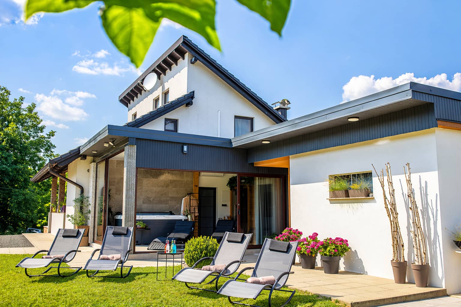 Countryside Home 19 is a modern house situated on a hill in Gornje Međimurje with stunning views of the surrounding landscape. The name is inspired by frequent visitors to the estate – ladybugs. Surrounded by untouched nature, the house provides warmth and comfort, making it ideal for families with children.