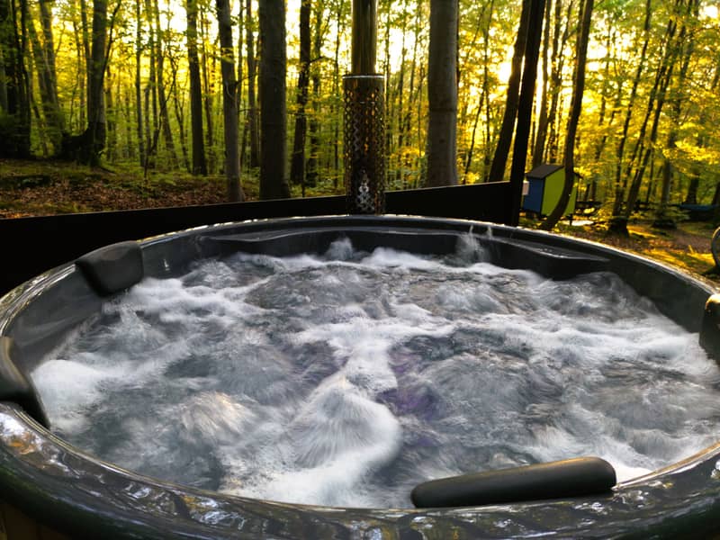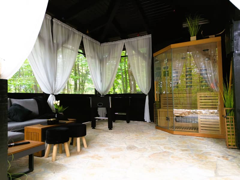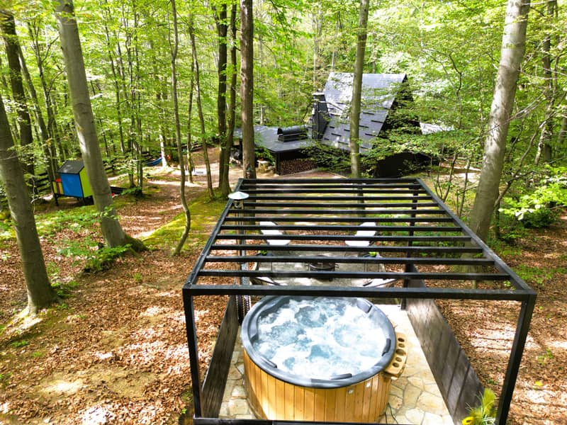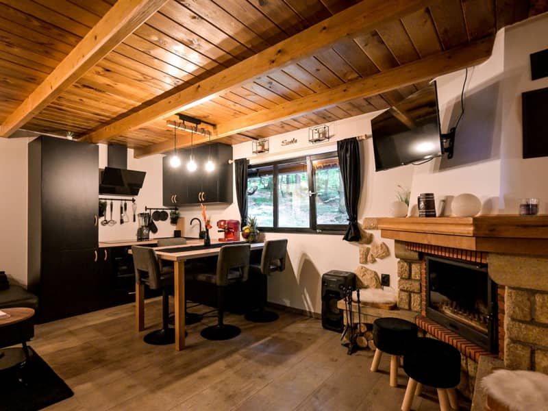 During summer, a private outdoor pool (available from June 1st to September 1st) surrounded by forest creates an indescribable experience of swimming in nature. Two covered terraces add to the charm: one with a jacuzzi and wooden loungers for pure relaxation, the other with a barbecue and bread oven for evenings with family and friends. A smaller terrace with a firepit and hammock is ideal for intimate moments, while entertainment such as darts, board games, badminton and archery keep everyone engaged.