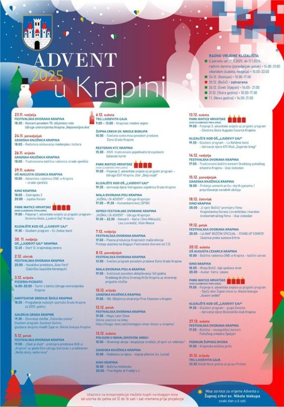 This year’s Advent in Krapina offers an exceptionally rich and diverse program that includes musical concerts, cultural events, workshops, performances and traditional Advent activities. The program began at the end of November with a series of literary and musical evenings and continues throughout December with the lighting of Advent candles, choir concerts, children’s performances, dance programs, as well as sports and humanitarian activities. Particularly noteworthy are the Krapina Honey Fair, numerous concerts in the festival hall and the city library, the ice rink near “Ljudevit Gaj” Elementary School, and the Advent attractions in Matica hrvatska Park.