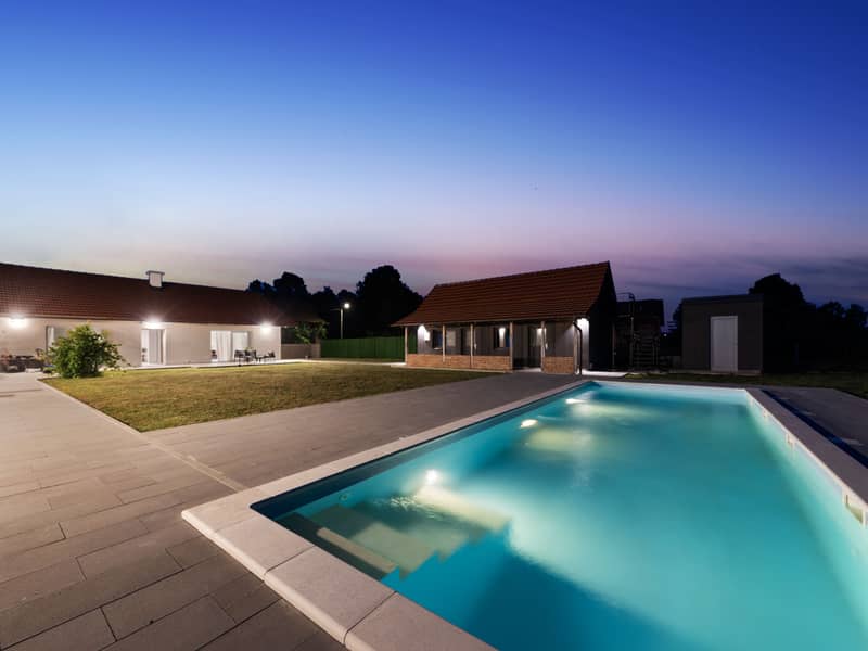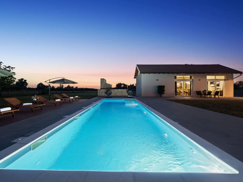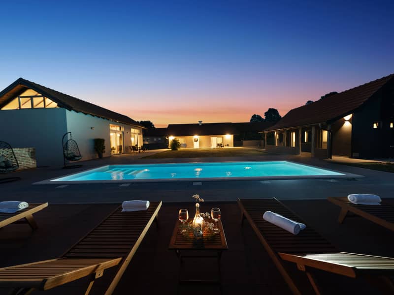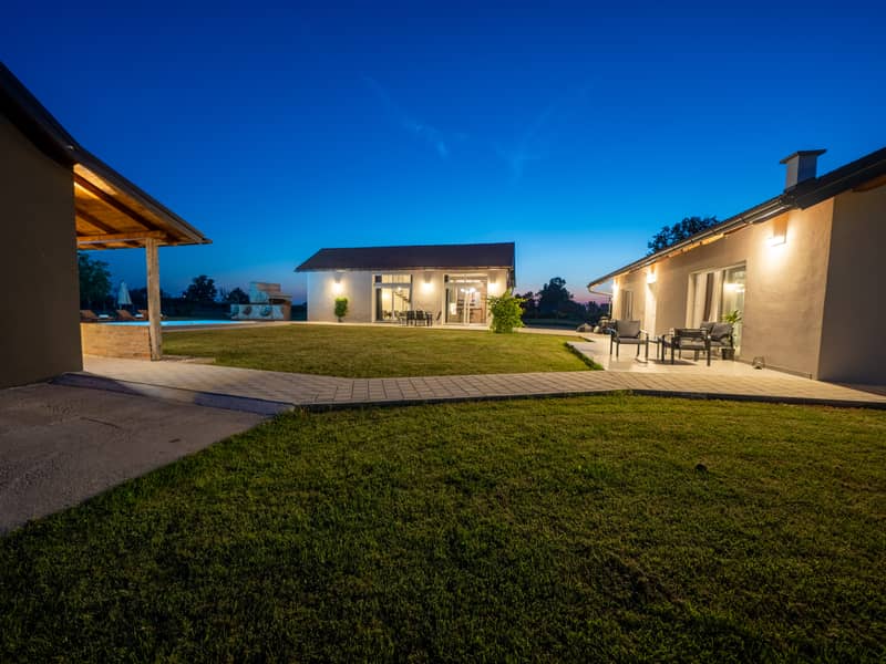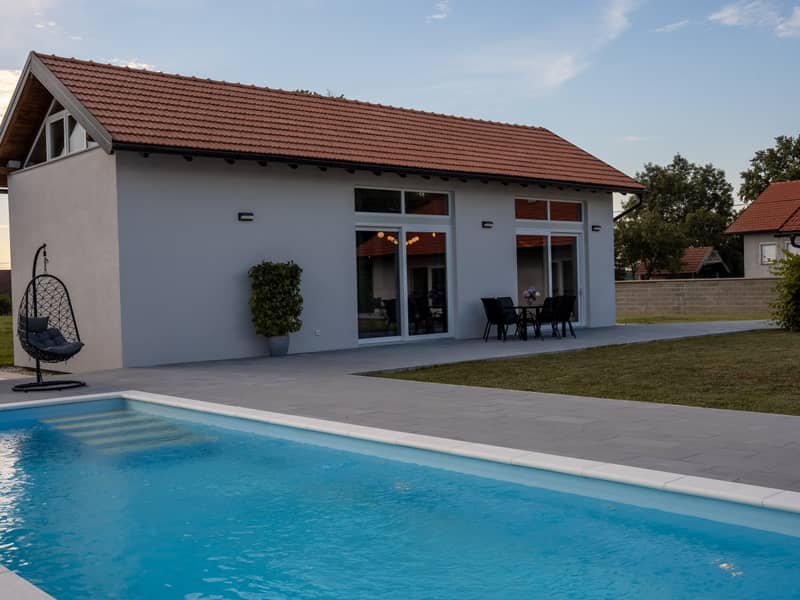 Zelena Oaza u Kloštar Ivaniću pruža luksuzan boravak na ograđenom imanju od 3 000 m² s ukupnim kapacitetom do 8 osoba, idealno za obitelji i prijatelje. Glavna kuća za proslave kombinira beton i ciglu, s modernom kuhinjom, velikim stolom za 30 osoba i chill prostorom na galeriji. Staklene stijene vode na prostranu terasu, dok grijani bazen od 40 m² i osvijetljeno dvorište stvaraju posebnu atmosferu za druženja i proslave.