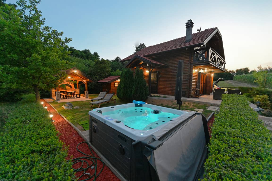 Poseban doživljaj pruža vanjska kućica s infracrvenom saunom, idealna za hladnije mjesece, dok jacuzzi na otvorenom poziva na opuštanje tijekom cijele godine. Prostrana okućnica okružena zelenilom pruža dovoljno prostora za boravak na svježem zraku, a sunčalište i natkrivena terasa s rustikalnim stolom, zidanim roštiljem i pekom savršeni su za obiteljska druženja.