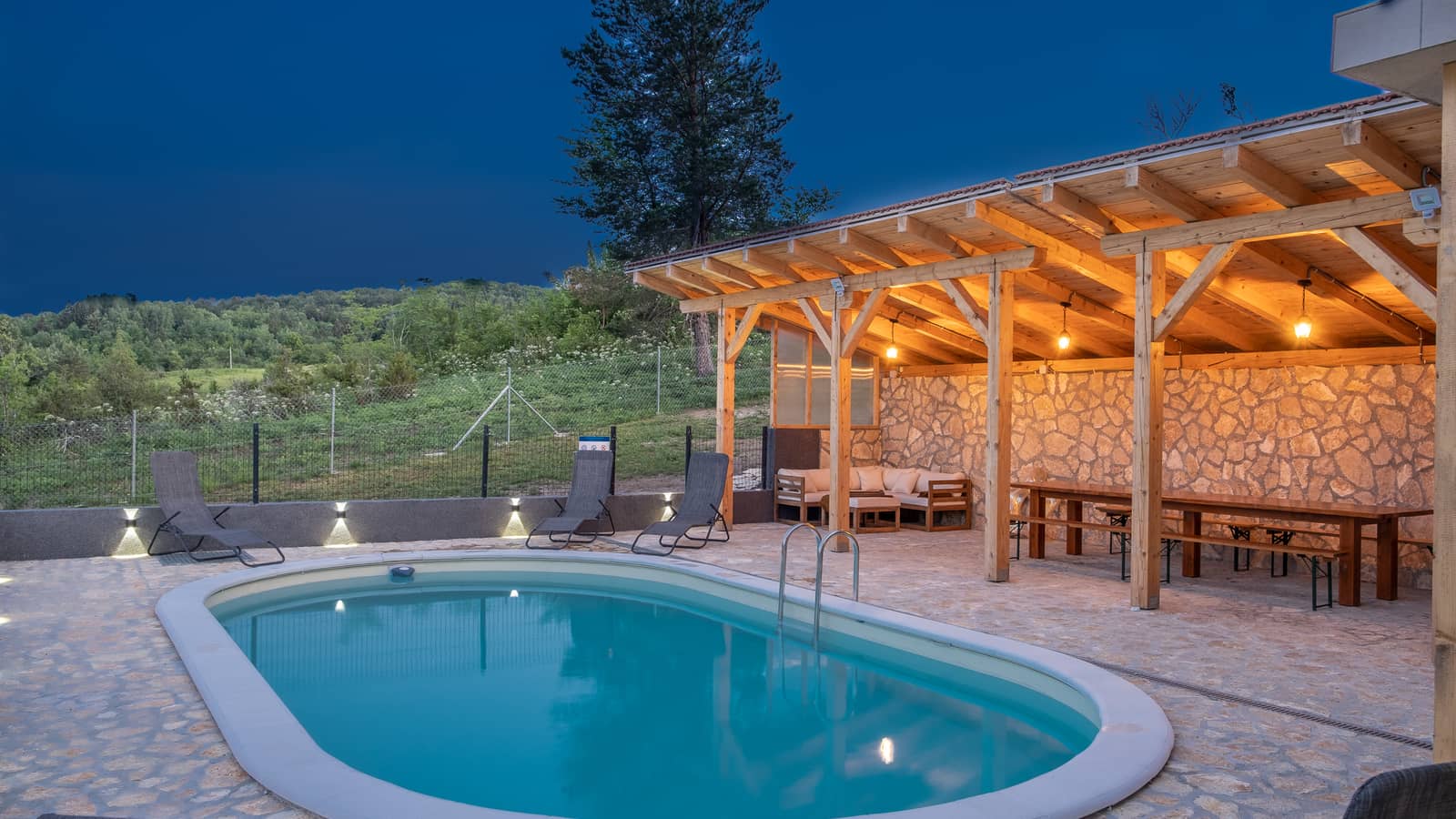 Tijekom ljetnih mjeseci gosti mogu uživati u vanjskom bazenu i sunčalištu, dok je tijekom cijele godine dostupna spa zona s jacuzzijem i saunom — idealna za opuštanje nakon aktivnog dana. Natkrivena terasa uz bazen s roštiljem savršena je za večernja druženja, obroke na otvorenom i ugodne ljetne noći.