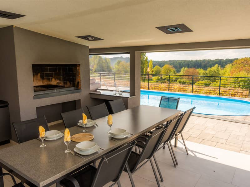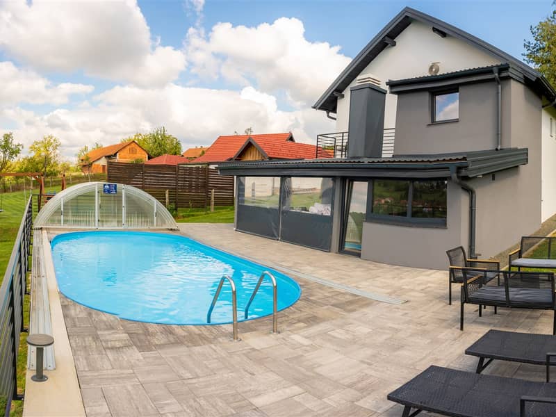 U hladnijim mjesecima uživat ćete u prostranom interijeru s idiličnim doživljajem prirode i promjenom godišnjih doba. Relaks zona uključuje saunu za detoksikaciju tijela i unutarnji jacuzzi za potpuni odmor. Tijekom toplijih mjeseci osvježite se u vanjskom bazenu ili se opustite na natkrivenoj terasi. Ljetna kuhinja s roštiljem omogućuje pripremu omiljenih jela i zajedničke obroke u obitelji.