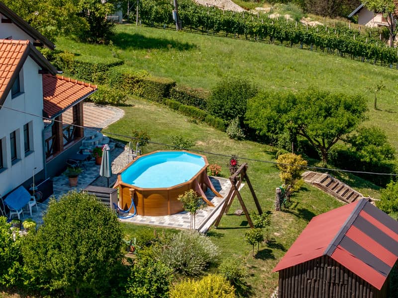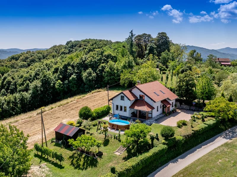 Tradicionalno uređena kuća pruža privatnost i mir u zelenilu, a tijekom hladnijih mjeseci toplinu stvara kamin u dnevnom boravku uz pogled na prekrasan varaždinski pejzaž. U toplijim mjesecima gosti mogu uživati u vanjskim sadržajima: montažnom bazenu, šetnici kroz voćnjak, vanjskom jacuzziju, sauni te terasama za odmor i roštiljanje s panoramskim pogledom.
