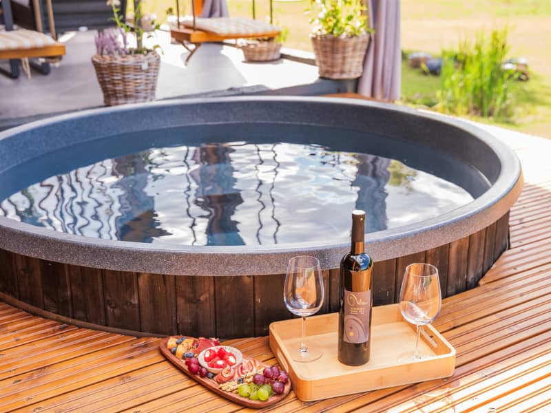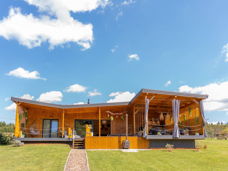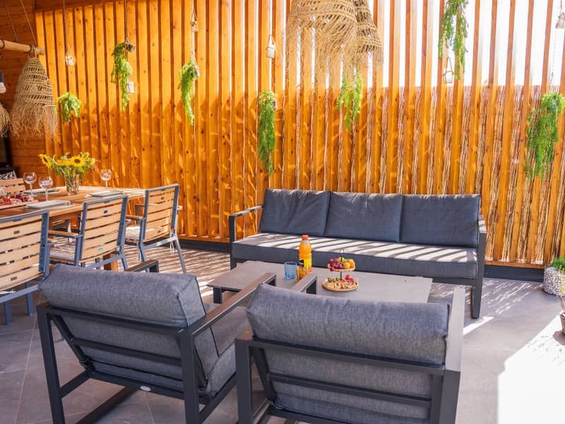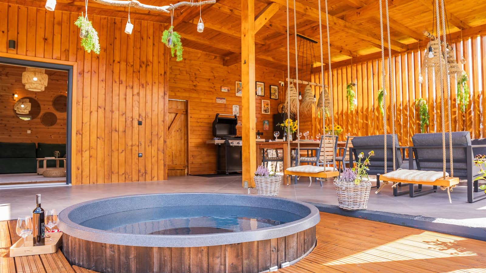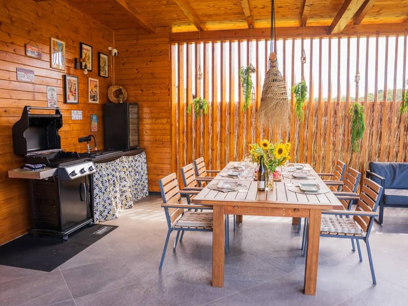 Središnji dio kuće čini natkrivena terasa od 80 m² podijeljena u tri cjeline: potpuno opremljena vanjska kuhinja s roštiljem i blagovaonicom, lounge kutak za druženje te intimni kutak s ljuljačkom za opuštanje i čitanje. Na terasi se nalazi i jacuzzi na loženje s pogledom na prirodu, dok dvorište nudi sunčalište s ležaljkama, vanjsko ložište i brojne sadržaje za djecu i odrasle – stijenu za penjanje, mali nogomet, mrežu za odbojku i badminton, luk i strijelu te hammock za potpuni odmor. Poseban doživljaj pruža šator za spavanje pod zvijezdama.